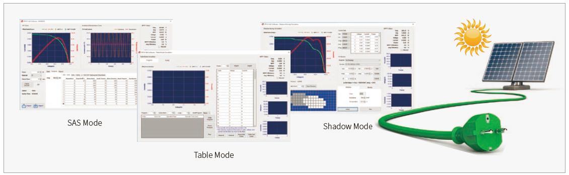 IT6000C系列选配SAS1000太阳能电池矩阵仿真软件,可仿真太阳电池矩阵的I-V 曲线,内建EN50530、Sandia、NB/T32004、CGC/GF004、CGC/GF035的SAS 模型,用户简单设定参数后,即可模拟I-V曲线输出并生成报表,用于测试光伏逆变器的静态和动态最大功率追踪效能。用户还可以编辑任何屏蔽可达4096个点的I-V曲线实现动态云遮效果,或存储100条不同光照、温度下的I-V曲线于内存,并设定每条曲线执行时间及执行顺序,以此来测试光伏逆变器在不同气候条件下的长时间最大功率追踪效能。